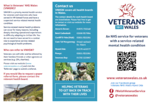 - Veterans NHS Wales is a priority mental health service for veterans and reservists who have served in HM Armed Forces. They can provide comprehensive assessments and psychological therapy to veterans with common mental health problems attributable to their military service e.g. as PTSD, anxiety and depression, or those that arise from peace-keeping / humanitarian operations, being bullied in service, or in response to a military attributable physical injury. They can also signpost or refer veterans on to other services who can offer appropriate assistance. Call 01570 422577.