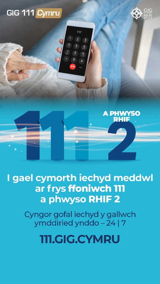 - Mental Health and Wellbeing – “NHS 111 Press 2”. The service is available 24 / 7 if you need to talk to someone urgently about your mental health, or you’re concerned about a family member. Call NHS 111 and select “option 2” to be placed in direct contact with a mental health worker in your area.